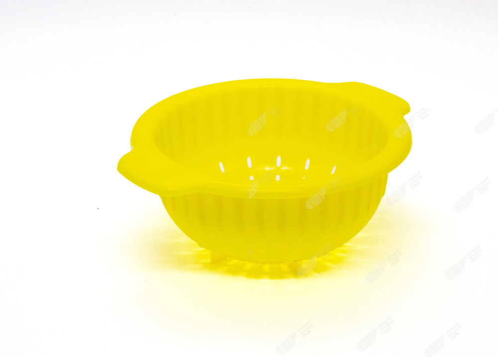 Дуршлаг в форме чаши с двумя ручками удобен для промывания овощей, фруктов, ягод, зелени, грибов. Изделие обладает достаточной устойчивостью благодаря специальным ножкам на дне, поэтому его можно ставить на плоскую тарелку или поддон для стока лишней воды. Большое количество сливных отверстий на корпусе дуршлага обеспечивают быстрый слив жидкости.